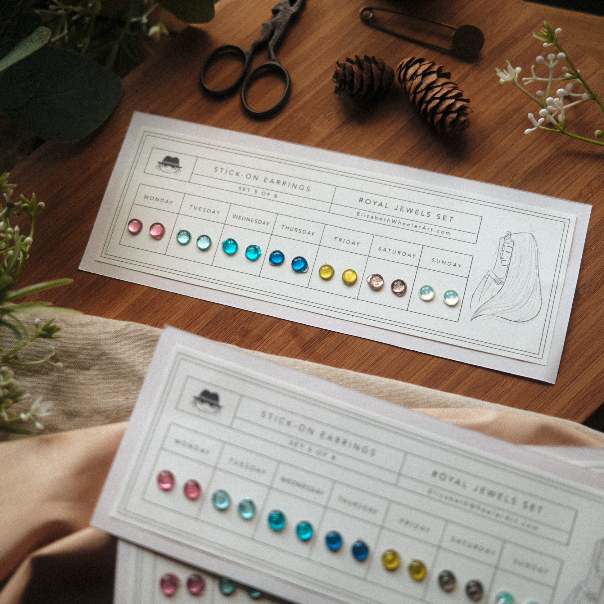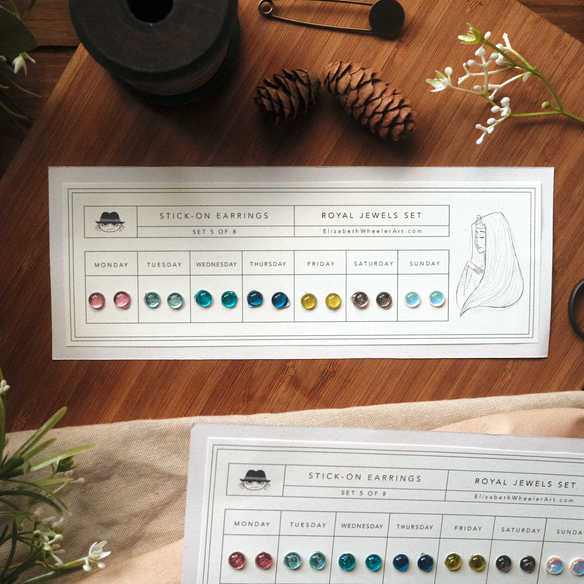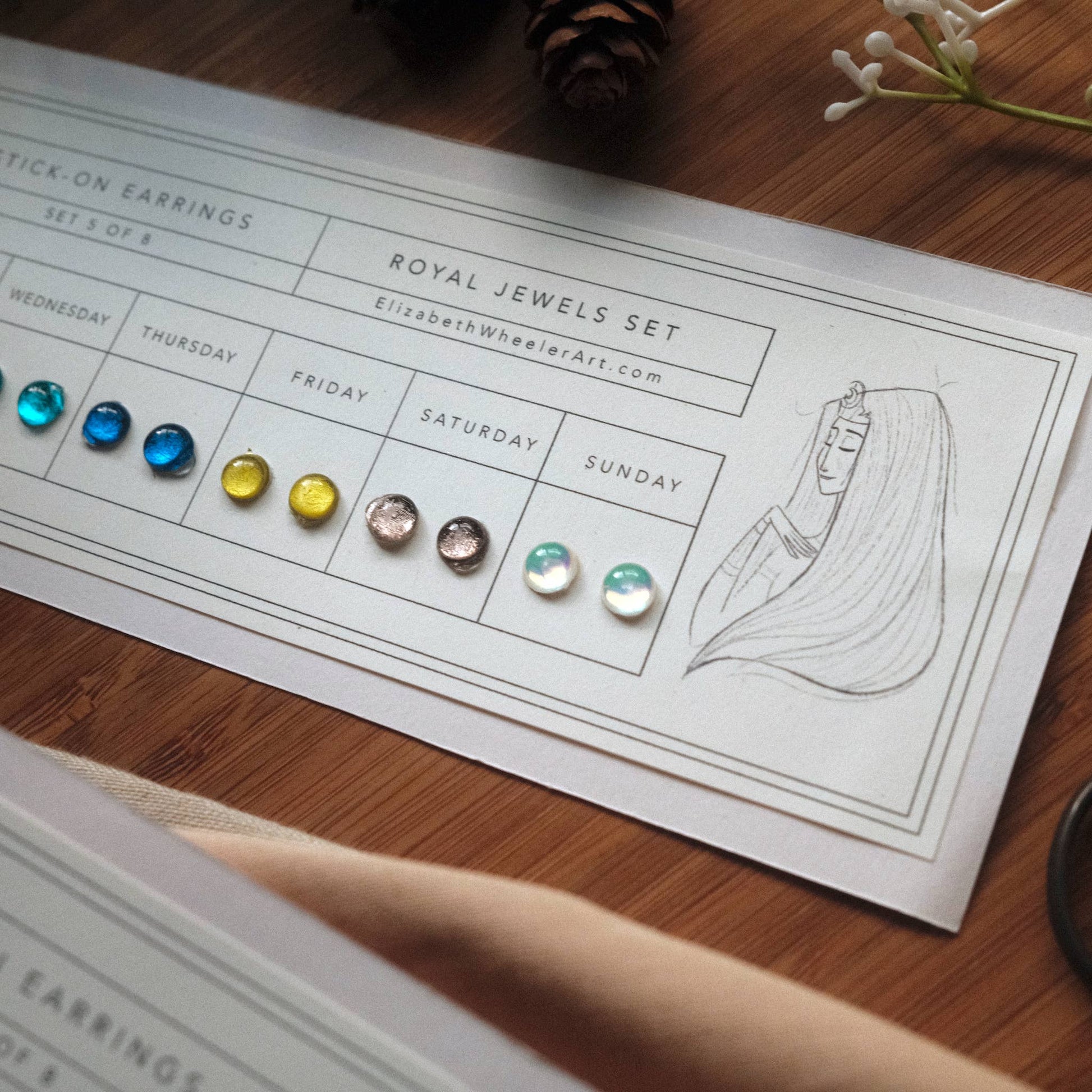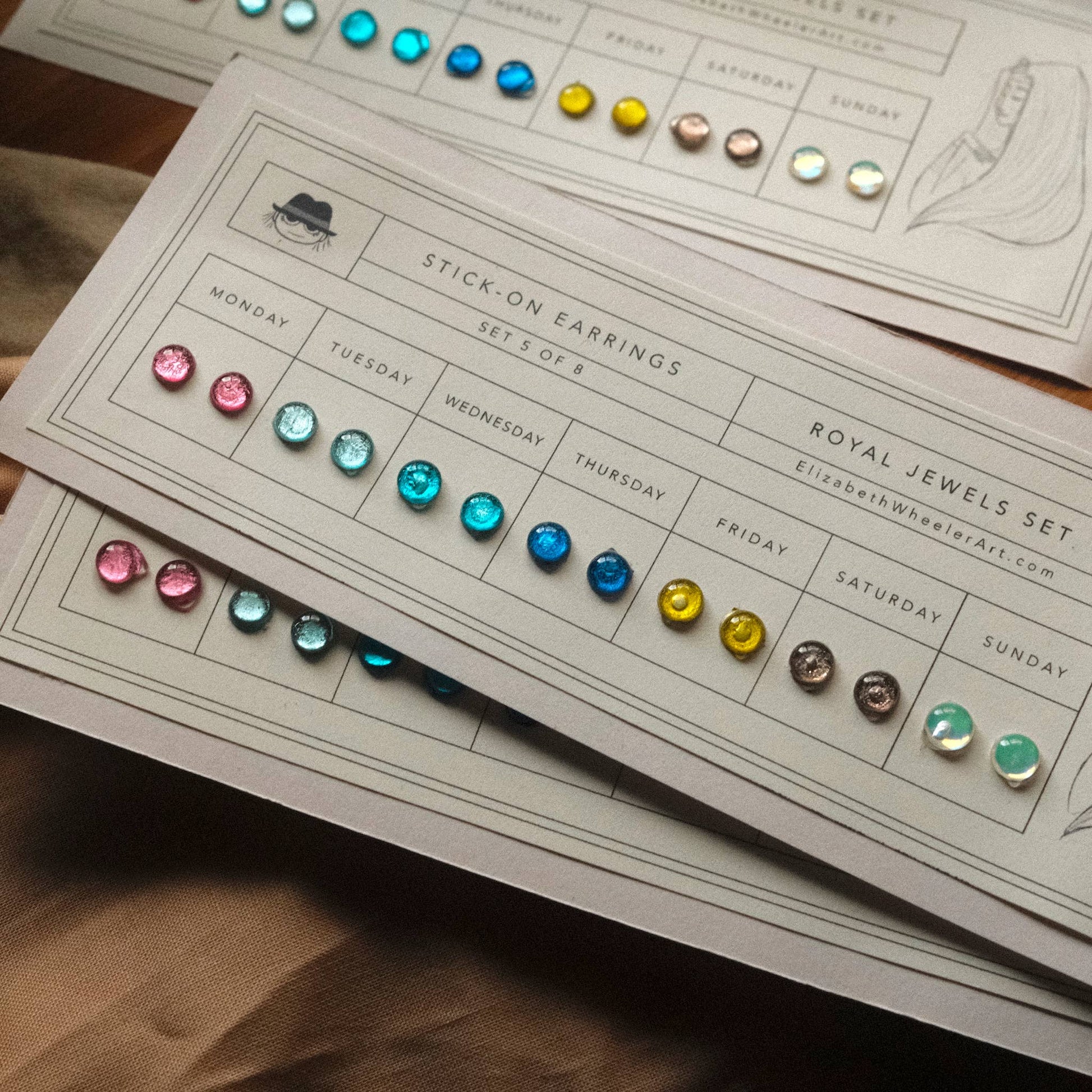 A flash back to the past, this Royal Jewels Stick-On Earring set features a new color for each day of the week! Earrings are metallic-holographic and shimmer in the light. Just peel and stick! Each stay on up to 24 hours. Since each item is handmade, please allow slight differences between orders.