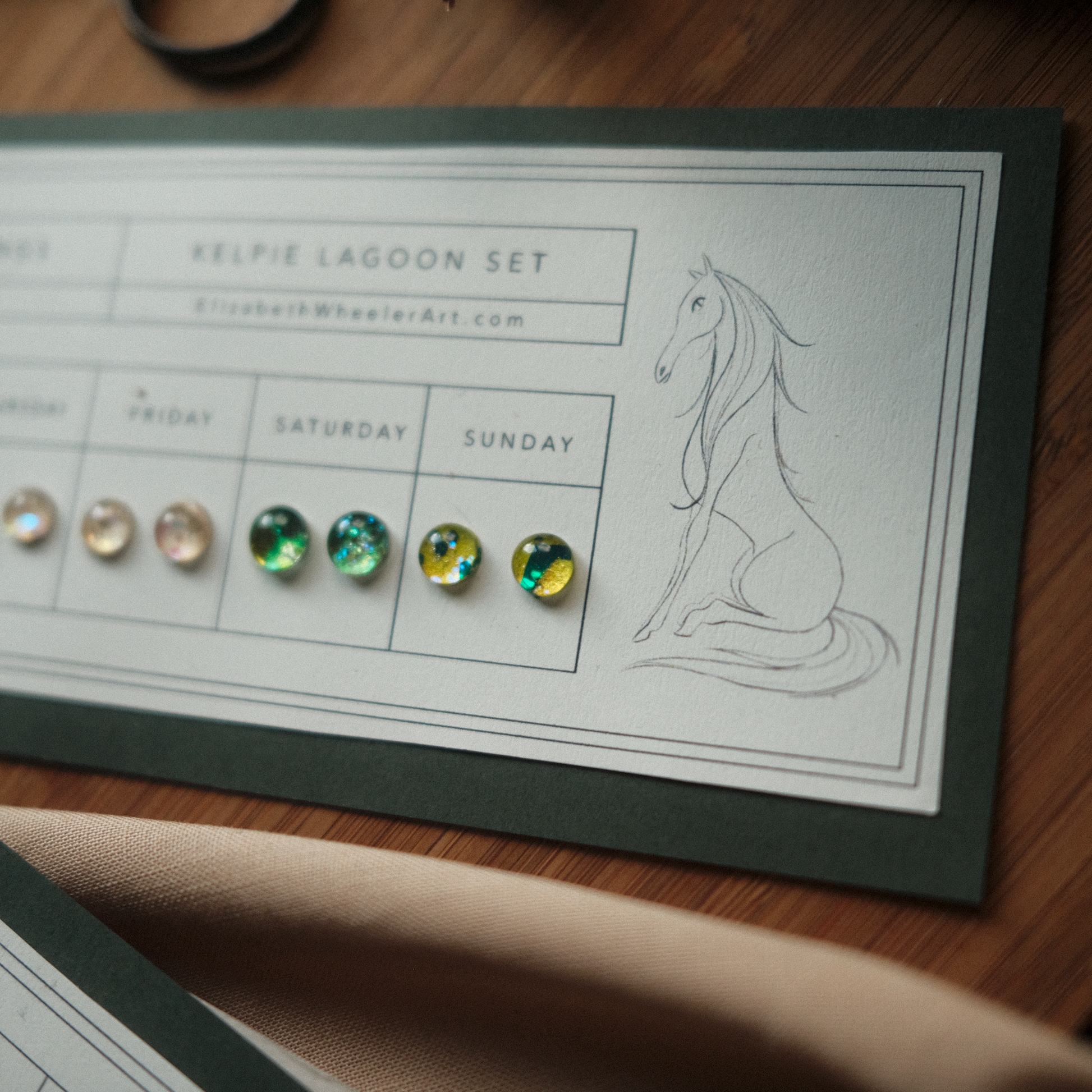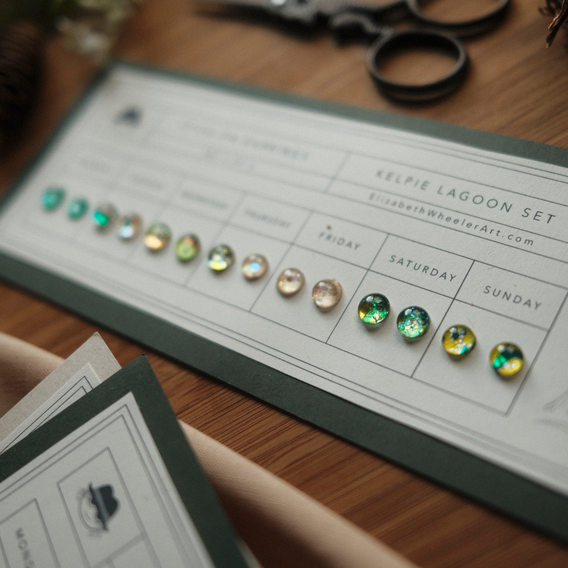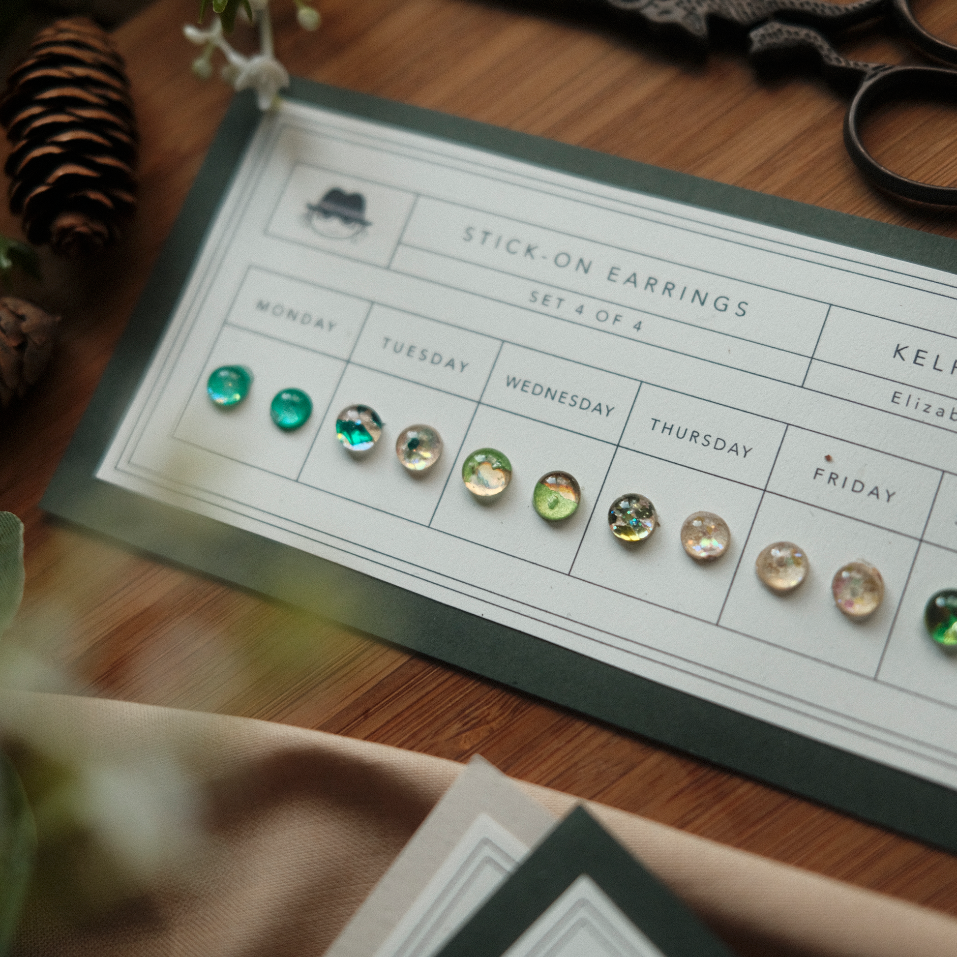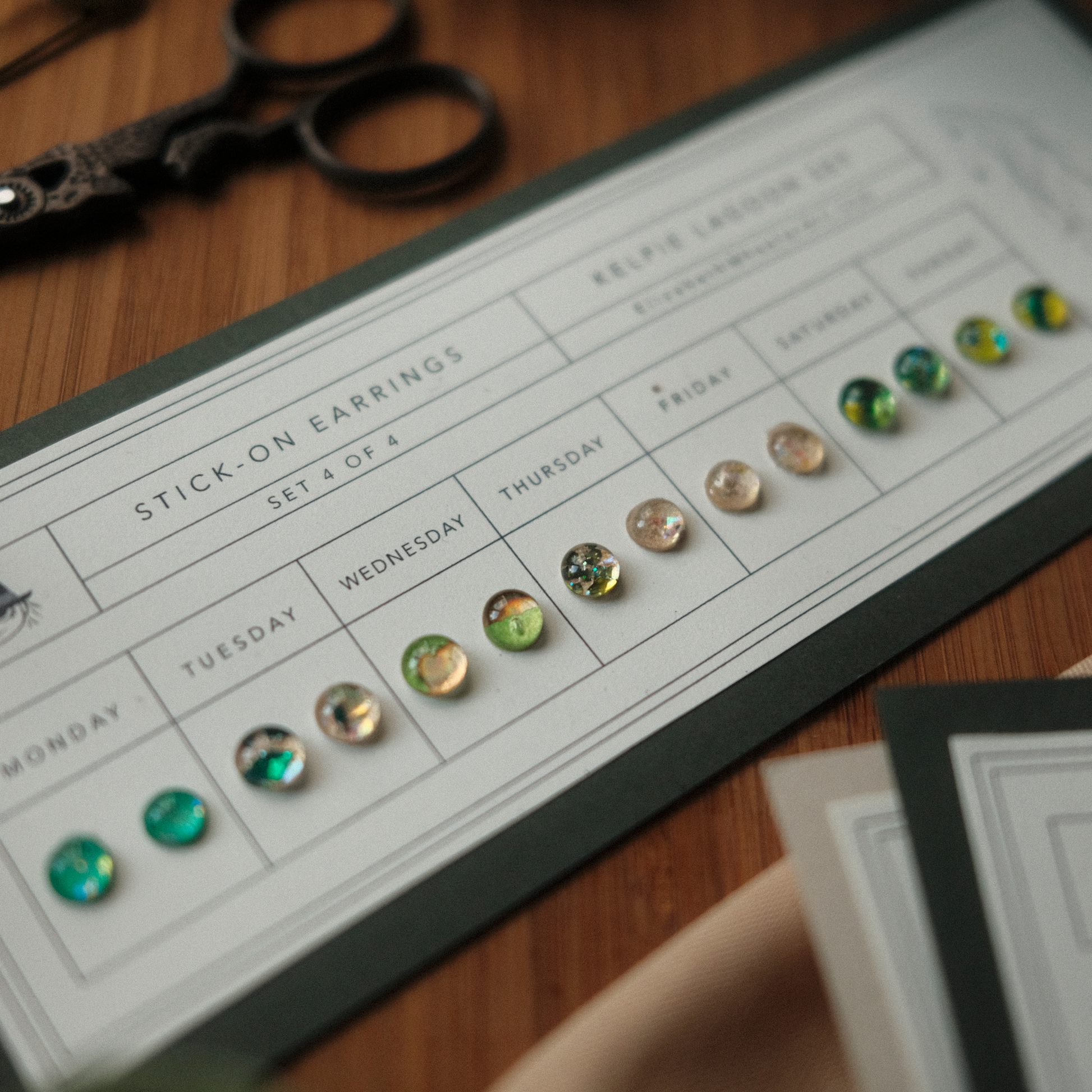 A flash back to the past, this Kelpie's Lagoon Stick-On Earring set features a new color for each day of the week! Earrings are metallic-holographic and shimmer in the light. Just peel and stick! Each stay on up to 24 hours. Since each item is handmade, please allow slight differences between orders.