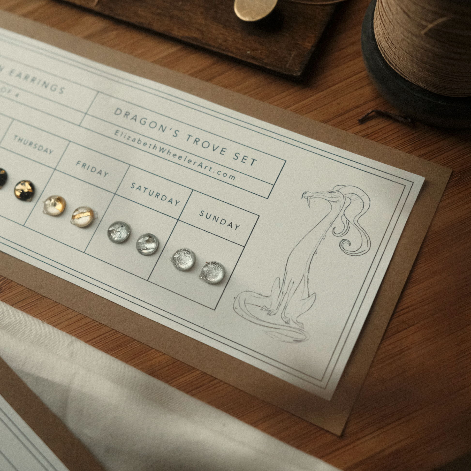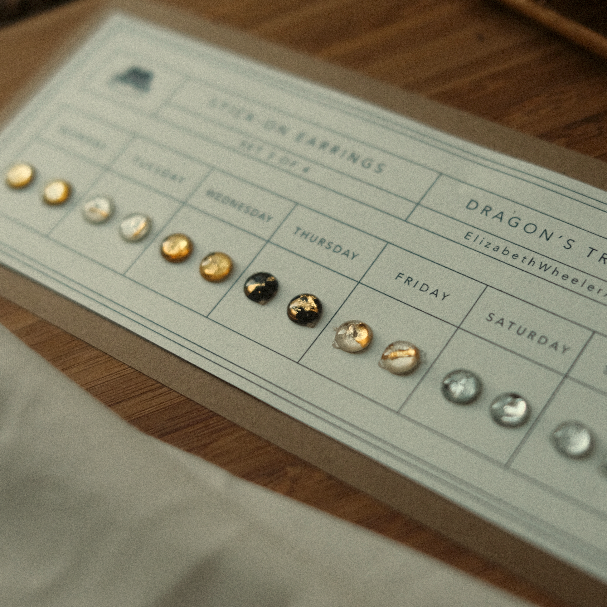 A flash back to the past, this Dragon's Trove Stick-On Earring set features a new color for each day of the week! Earrings are metallic-holographic and shimmer in the light. Just peel and stick! Each stay on up to 24 hours. Since each item is handmade, please allow slight differences between orders.