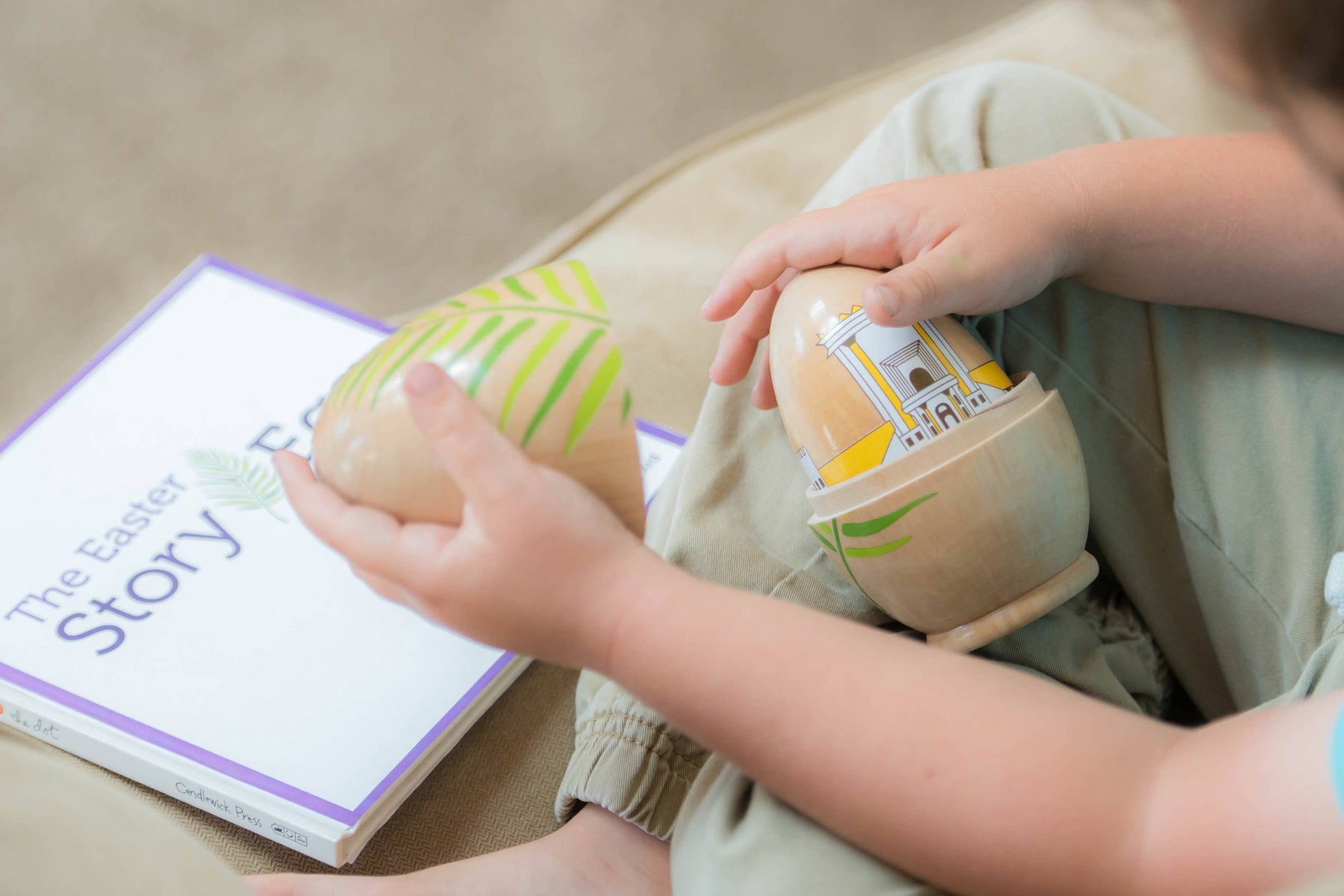 The story egg is a family activity that celebrates the true meaning of Easter. This family activity includes a hardcover book and 7 wooden nesting eggs. The story egg book begins on Palm Sunday and ends on Easter Sunday.