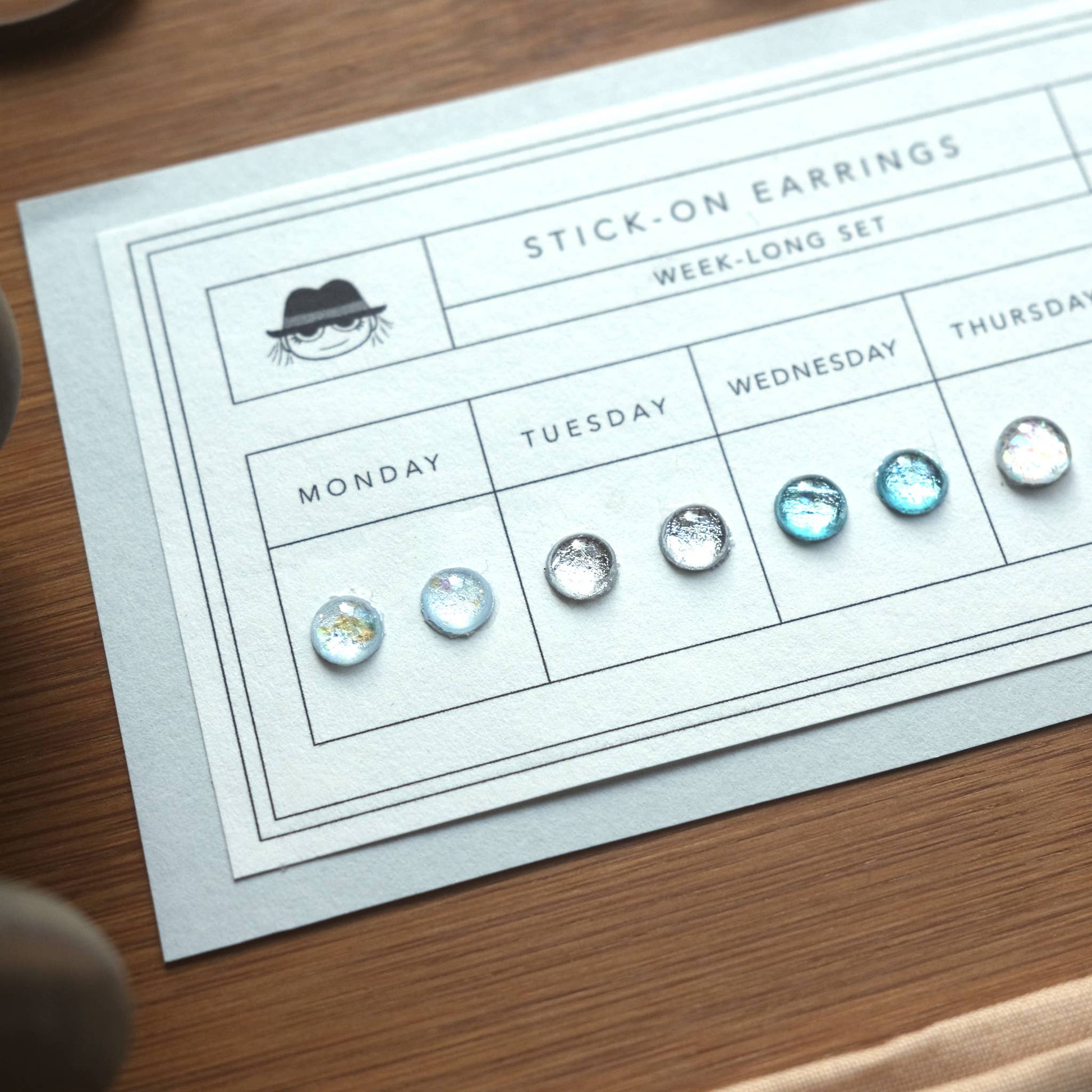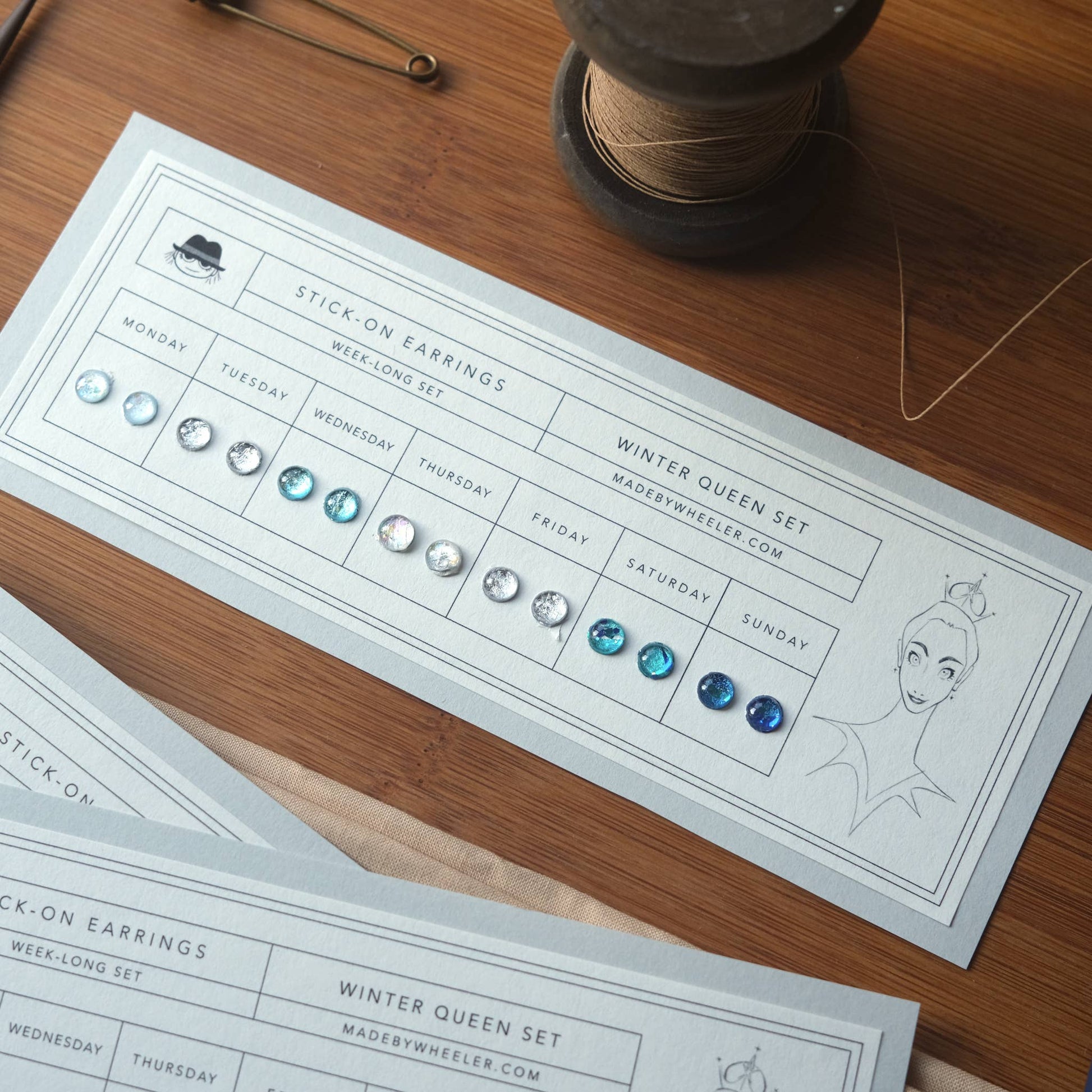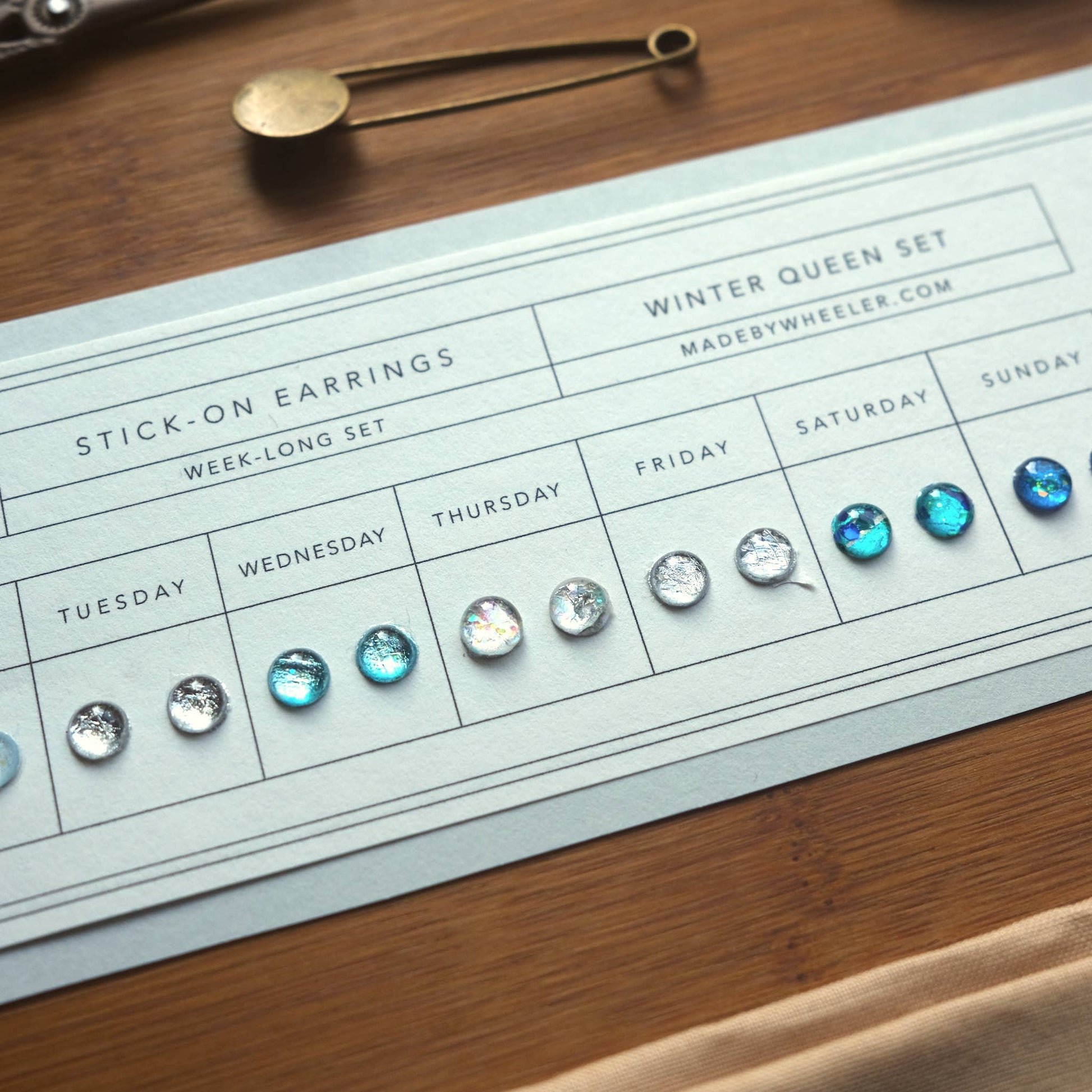 A flash back to the past, this Winter Queen Stick-On Earring set features a new color for each day of the week! Earrings are metallic-holographic and shimmer in the light, just peel and stick! Each stay on up to 24 hours. Since each item is handmade, please allow slight differences between orders. Items are all handmade in the USA by Made by Wheeler.